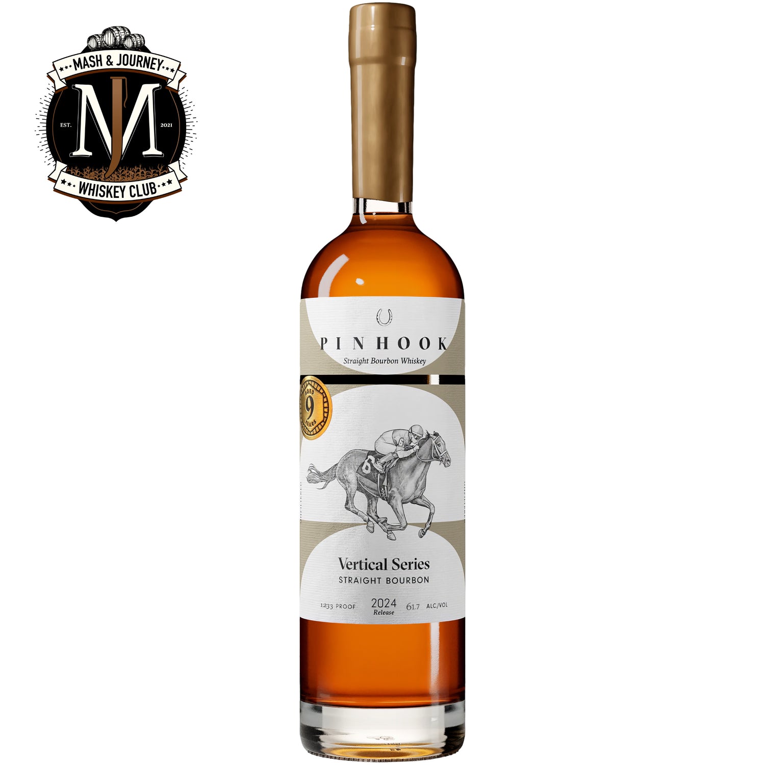 Discover the 9-Year Single Barrel pick from Mash & Journey, part of Pinhook’s acclaimed Bourbon Vertical Series. This single barrel offers a vibrant tasting experience and a remarkable journey of flavors as these premium MGP barrels. Bottled at 123.3 proof and unfiltered at cask strength, this expression showcases Pinhook’s dedication to capturing the evolving nuances of age and craft.